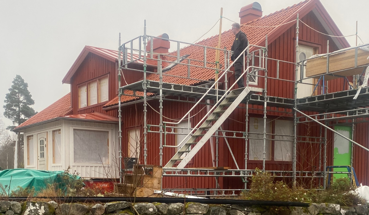 En eternitklädd stuga i Hårestorp i Kalvsvik under förändring. Den byggs till ett rum och taket lyfts. Beställarens önskemål mär