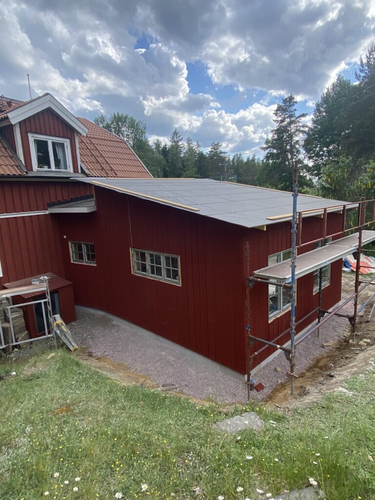 Keramikern Malin Grumstedt behövde en större verkstad. Innan denna tillbyggnaden i bottenplanet hade hon verkstaden i det fd garaget i källaren, som fortsättningsvis också fungerar som verkstad. I den nya delen kan Malin ha utställningar och ha keramikkurser. Malins specialitet är kavling och att arbeta med färgade porslinslera, hon kallar tekniken “intarsia”
