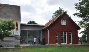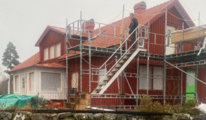 En eternitklädd stuga i Hårestorp i Kalvsvik under förändring. Den byggs till ett rum och