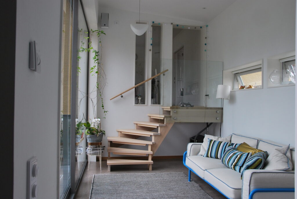 Familjen behövde fler sovrum. Den fina 20- talsvillan fick en tillbyggnad med en länk mellan det äldste huset och den nya tillbyggnaden. Huset har en källare och bottenvåningen ligger flera trappsteg upp. Tillbyggnaden ligger i markplan och har fönsterdörrar direkt ut till gräsmattan. Tillbyggnaden är Faluröd för att likna uthusen som många villor har i den omedelbara närheten. Bilden nedan visar länken mellan de två byggnaderna.